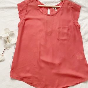 Lightweight dark hot pink top with pocket on chest, dressy style and capped sleeves.