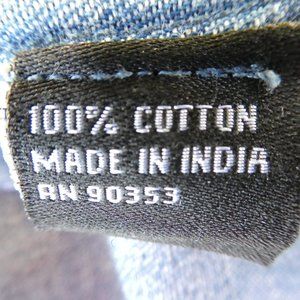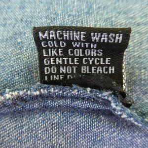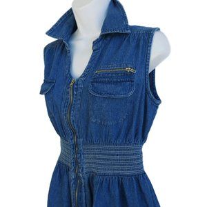 Vintage Denim Dress. Full Front Length Zipper. Smocked Waist. Chest Flap Pockets. V-Neck Collared. Cotton. Can double as an open front Vest. Made in India. Tagged Vintage Sizing PL. Measures Modern US Size Medium.