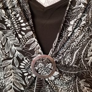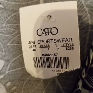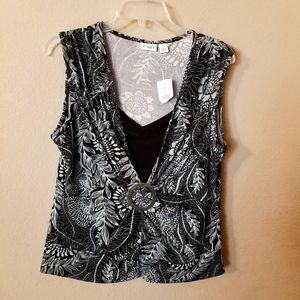 Cato Women's New Black with Green Floral Print Sleeveless Top. Black insert at neckline. Silver colored circular Disc that fabric goes through beneath breast area. NWT.
