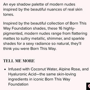 Too Faced Born This Way LIMITED EDITION Natural Nudes. A palette of modern nude shades inspired by the beautiful nuances of real skin tones. Coconut Water: Aids in delicately replenishing skin’s moisture levels. Alpine Rose: Helps support skin’s health and resilience. Hyaluronic Acid: Gives a smoother, more youthful appearance. Free of parabens. It is also gluten-free and cruelty-free. This variety of modern nudes range from flattering mattes to enhance your skin’s undertones to metallic, shimmer, and sparkle shades for a sexy radiance. The shades are highly pigmented, have a creamy texture, are easy to blend, have one-swipe payoff, and have instant pickup with a brush. Brand new, in box.