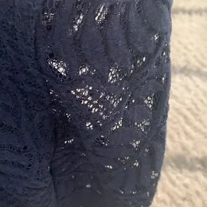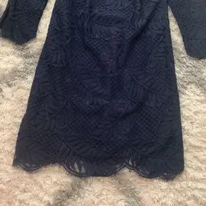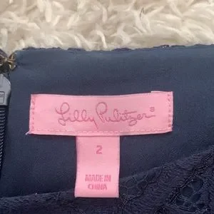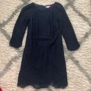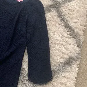 Lily Pulitzer size 2 navy blue dress. Sleeves are 3/4 sleeve lace. Wore once to a wedding, dry cleaned only