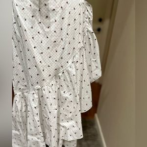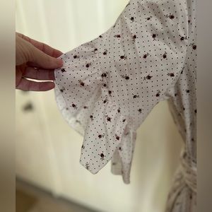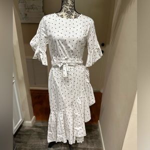 Great for spring and summer, cut dots pattern with small flower buds adorn this dress. Wrap detail bottom gives the asymmetrical ruffle flourish down the front of the dress. Ruffle detail on sleeves as well. Pretty and feminine.