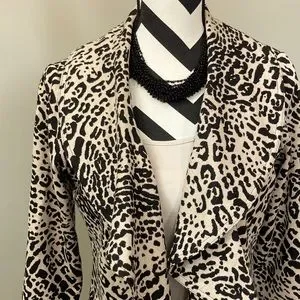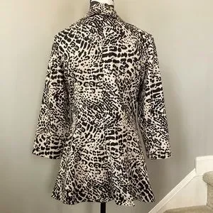 Calvin Klein Animal Print Open Jacket. Fabulous wardrobe staple! Tan & black. Cascading ruffle collar. 3/4 sleeves. Lined. No pockets. Laying flat approx 28” shoulder to hem, approx 19” pit to pit. 80 polyester 19 rayon 1 spandex. Size S. Excellent condition.