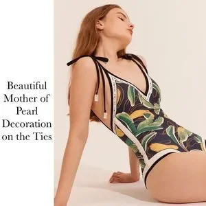 Reverse the suit for a whole new look! The suit is black with tropical leaves and flowers in shades of green, yellow, and orange. The sides of the suit are white.