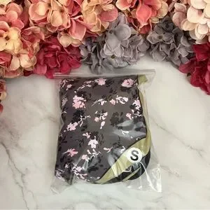 This gorgeous reversible suit is so unique! One side of the suit is split into two sides, the right side has shades of gray and black with pink flowers, the other side is green with pink flowers. The sides of the suit are green.