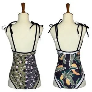 Boho Green & Black Floral Reversible Swimsuit with Shoulder Ties