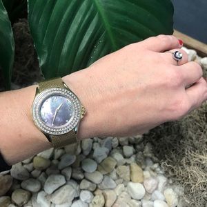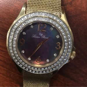 I do not have the original box, or paperwork. It is in need of a battery my price reflects that. It is in fabulous condition, gold in color with authentic Austrian Crystals and a beautiful black mother of pearl face. It has been stored in a watch box and is a beautiful piece.