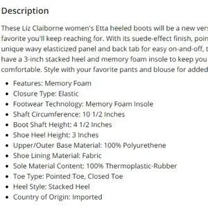NIB Liz Claiborne Women's Heel Booties Tan and Gold. These Liz Claiborne women's heeled boots will be a new versatile favorite you'll keep reaching for. With its suede-effect finish, pointed toe, and unique wavy elasticized panel and back tab for easy on-and-off, they also have a 3-inch stacked heel and memory foam insole to keep you comfortable. Style with your favorite pants and blouse for added polish. Measurements in last picture.