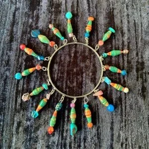 Handmade dangling bead bracelet in multicolor beads from World Tribe. Sourced from paper beads purchased in Uganda to support moms sending their kids to school (their schools cost money so many moms sell their art for this reason). It’s a fun style to wear and the beads are secured with double hoops so they can’t be pulled off. Boho, hippie, ethnic…fun!! 7” inner circumference. One size fits most.