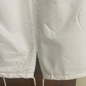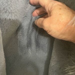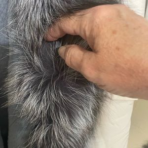 This is a beautiful authentic silver fox fur jacket with an authentic rabbit fur lining. Bust size 48. It is water resistant and white goose down filled. This beauty is brand new and never worn. It features a large beautiful fox fur trimmed and fur lined hood. The lining and trim are removable. This is a very heavy warm substantial jacket. It is heirloom quality.