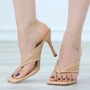 Nude T Strap Open Square Toe High Heel Thong Sandal