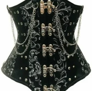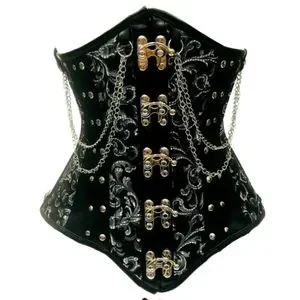 Top drawer steel boned underbust corset w/chains and clasp made of premium brocade fabric ,premium front clasp closure, 8 spiral steel bones and 4 static bones ,100% cotton lining,waist tape 6 modesty panel, nickel brass grommets with laces at back ,thick cording in the back for Cinching, garter loops hand wash