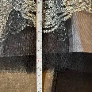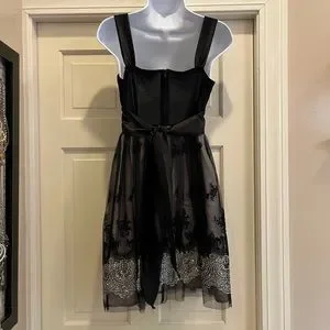 GORGEOUS black dress with straps and sheer overlay with velvet design and sparkles on skirt. Perfect congestion. Love this dress!! It has vintage sparkle pins on the straps.