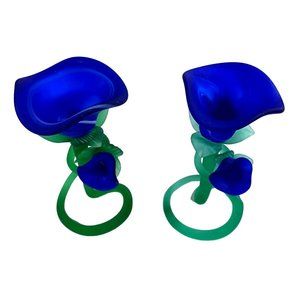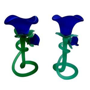 These stunning Murano candle holders were made in Italy crica 1980s. They are as beautiful now as when they were first purchased. The colors are amazing! The flowers are cobalt blue with white swirls. They have a bit of a frosted quality to them. They have twisted green stems. No two were ever alike. These have never had a lit candle in them.