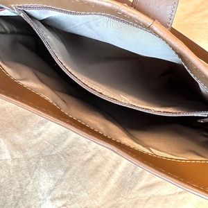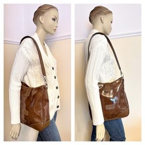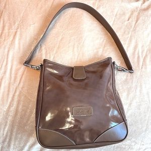 This authentic Dooney & Bourke shoulder bag has silver tone hardware, a wide and comfortable shoulder strap and a zip pocket inside.