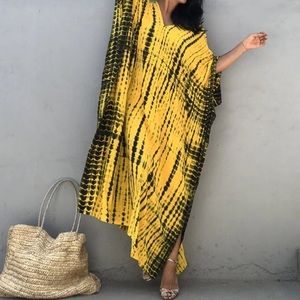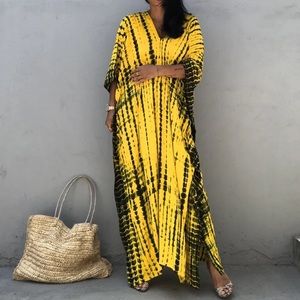Yellow tie dye printed boho long maxi length tunic coverup kaftan kimono dress. This can be worn as a swim coverup or daytime casual dress. Calf height side slits.