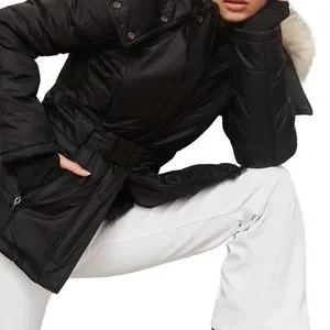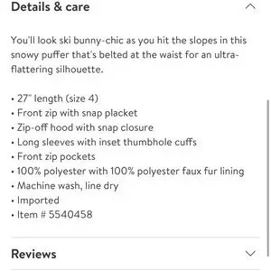 New never worn. Bought it for a snow trip a few years ago and didn’t end up wearing. So cute!!! Zipper closure with a cinching belt. Lots of pockets. You’ll forsure be super warm and dry in this in the snow!! It’s just been stored in my closet. NWT! Fits like a small.