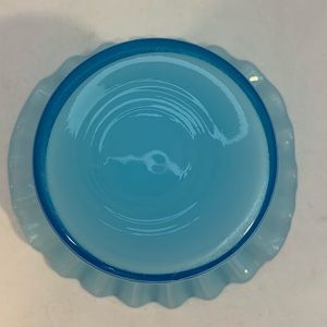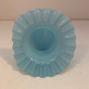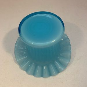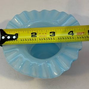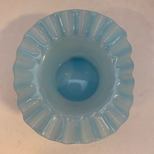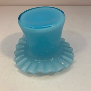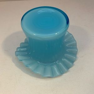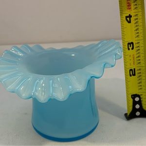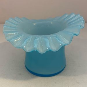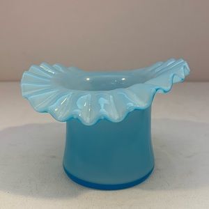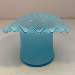 Vintage hat vase, light blue in color with a ruffled edge. Measures 3”x 4 1/4”