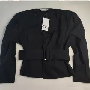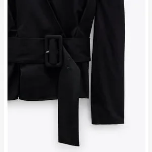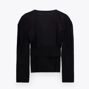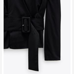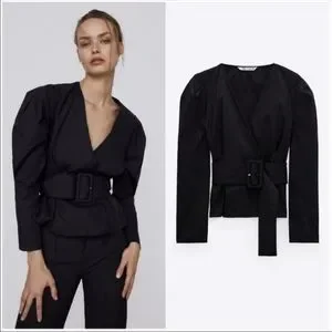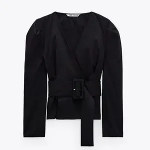 NWT* Zara Belted Puff Shoulder Poplin Wrap Blouse Black Top Shirt
