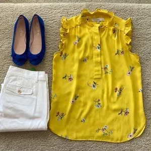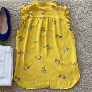 LOFT Yellow Floral Sleeveless Blouse. Bright and summery! Ruffle at the shoulders and neck. Covered buttons. Shirttail hemline. Laying flat approx 25” shoulder to hem, approx 18.5” pit to pit. 100% polyester. Size XS. Excellent condition.