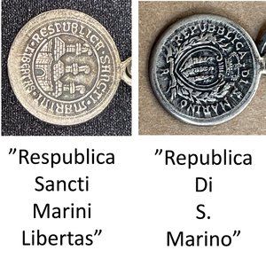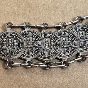 Very Good Vintage/Used Condition.* Vintage 1950's Republic Of San Marino coin link bracelet from Italy. Silver-tone metal. 7" Long x 7/8" Wide + 3/4" Extender and coin charm. Coins = 5/8" Diameter. Bracelet features 18 double-faced coins linked together with a chain; sturdy spring ring clasp. One side of coins is imprinted with "Republica Di S. Marino" and a royal insignia. The other side is imprinted with "Respublica Sancti Marini Libertas" and displays an architectural insignia. The bracelets were popular souvenirs from San Marino, Italy. Comes in jewelry gift bag from illness/smoke/pet-free home. Select other items from my closet, bundle & save on shipping! *Minimal tarnish, scratches & wear on some coins typical of a nearly 70-year-old piece.