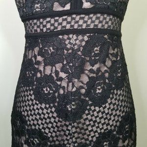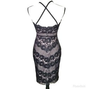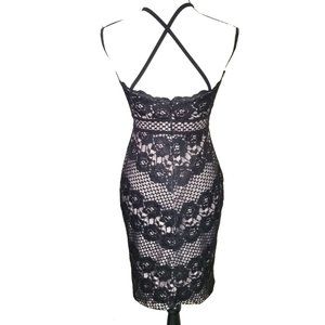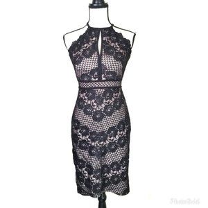 Morgan & Co Keyhole Floral Black Lace Overlay Nude Bodycon Dress
