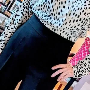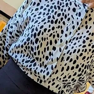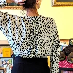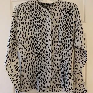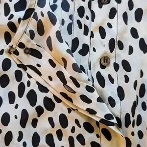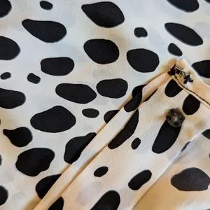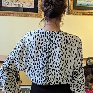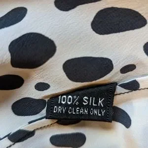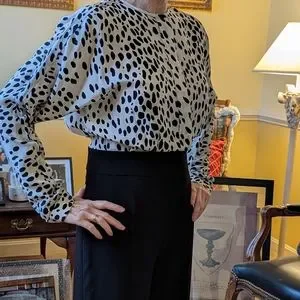 Gorgeous 100% Silk Vintage Oleg Cassini Blouse purchased in Washington DC and only worn a few times. Great style with button down front and pinched waist with peplum hem.Looks great tucked into high waisted pants or skirts,could also be worn with shirt tail out. White with black dots in an animal print graphic,whimsical and with a truly Contemporary feel! Dolman sleeves with dropped soft shoulder,original pads are removed. Excellent condition. Marked 8 but this was prior to Vanity sizing,would fit a 4 or 6 or a size small.