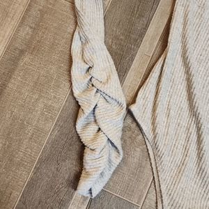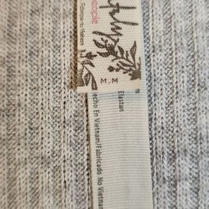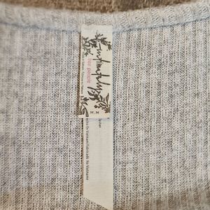 Free People brand gray super soft ribbed and fuzzy body suit in like new condition. size med. measurements are 30 inches from shoulder to snap at the crotch area. 18 inches across the chest and a 13 inch plunging V neckline. ruched sleeve at the wrist.