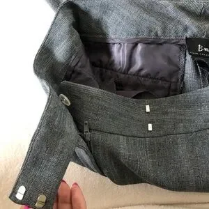 Bwear Gray Striped Trouser Dress Career Pants, dark charcoal gray base color with multicolored faint lines, straight leg slight flare, in great used condition, these used to be my favorite they are just too small now, size 5, waist laying flat 14.25, inseam 31.5 inches, rise 9 inches