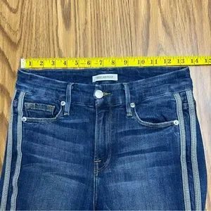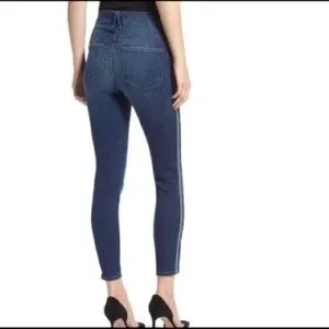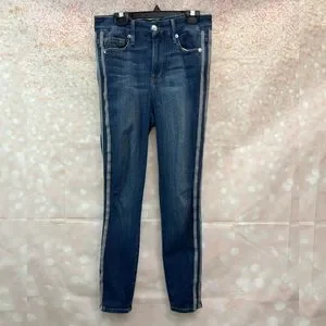 A gap-proof contoured waistband. Curve-sculpting stretch denim highlighted with athletic stripes. High waist. Side stripe. Stretch. New without tag: no flaws.