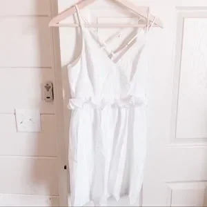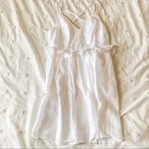 White peplum ruffled mini dress with criss-crossing back straps. Straps are adjustable. Dress is lined. Adorable! Perfect for a wedding guest or engagement photo shoot!