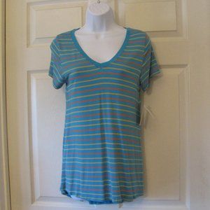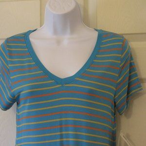 LuLaRoe Christy top in size 2XS XXS. New with tags NWT, retails for $35. V neckline and a high low bottom hem, short sleeves. Pretty blue with mustard colored & orange stripes. Swing, flowy style with stretch. Made from 95% rayon and 5% spandex, machine wash.
