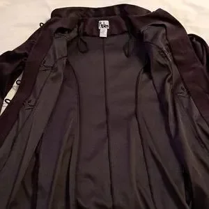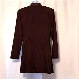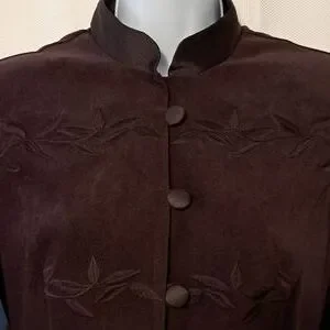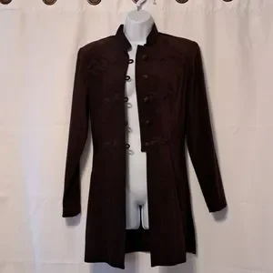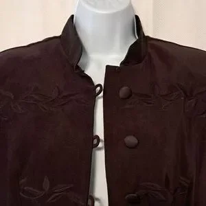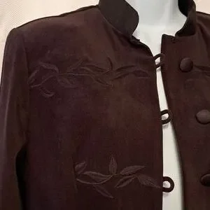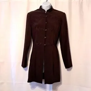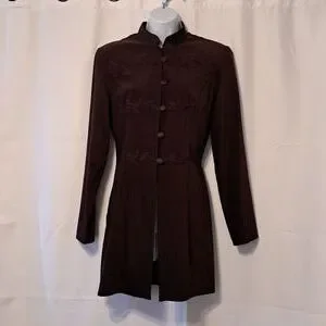 This jacket is gorgeous and like new!! Vintage R.J. & Co. just above knee length jacket with mandarin collar, covered buttons with loop closure and embroidery. Princess seaming on front and back for a beautiful silhouette. Slight shoulder pads, side slits, eggplant color. LOVE this jacket!!! Approx measurements flat-