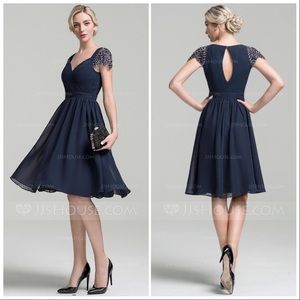 Absolutely beautiful dress from JJ’s House. Dark navy blue, with beaded/embellished sleeves. New with tags, sort of a sweetheart neckline.