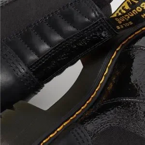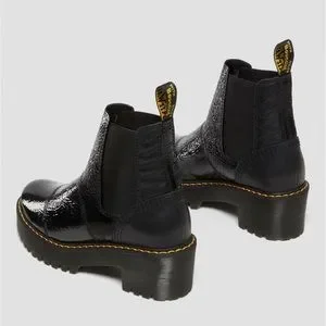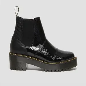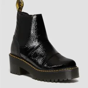 DR MARTENS ROZALIEDistressed Patent Heeled Black Boot is a PU-coated leather with a crinkle emboss patent effect