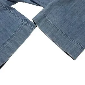 Light wash denim deck pants by Talbots. Flat front trouser styling with a zip fly and button closure. Pockets. Wide leg in a cropped length. Comfortable mid-weight cotton blend with spandex for a bit of stretch. Excellent condition. Size 10. See photos for exact unstretched measurements.