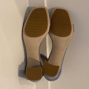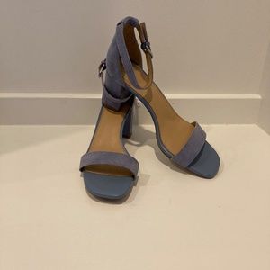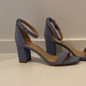 This elegant sandal features a 2.5" chunky block heel * Adjustable ankle strap with buckle closure * Lizard print suede upper & toe strap * manmade lining and sole * memory foam cushion lining. The color of these shoes is listed as light denim but they could also be considered periwinkle. They are beautiful!