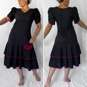 ~fitted, puff sleeves, v neck, black eyelet lace overlay on burgundy upper, layered skirt, fan bow on hip, midi length