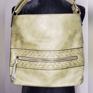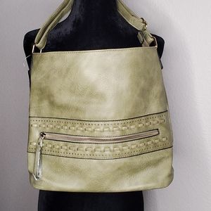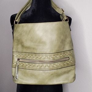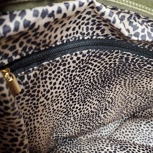 This purse is beautiful and elegant in olive green. Zippered pockets on front and back. Weave design and cutouts on front make this bag classy. One slip in and one zippered pockets inside purse. Interior has a fun leopard print. Adjustable strap. 13" x 11". 4.5" bottom.