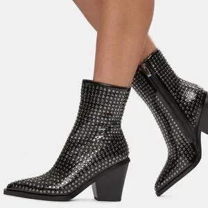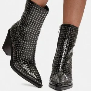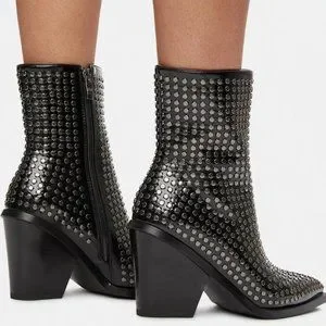 vegan leather upper, pointed toes, silver stud accents, and inside zipper closures.