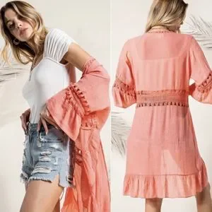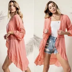 Stunning spring and summer kimono in a beautiful coral color with lace crochet trim detail.