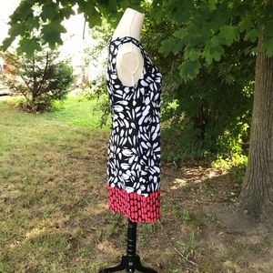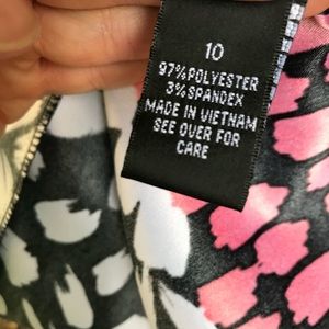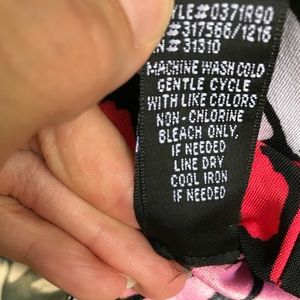 Black dress with white splotches on top and pink at the hem, preloved in very good condition. The pink splotches are nearly red so please don’t yell at me if you think they aren’t technically pink. 😊 Zipper in back goes 3/4 down. There is no lining.