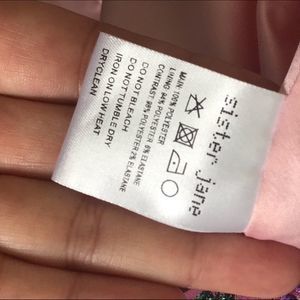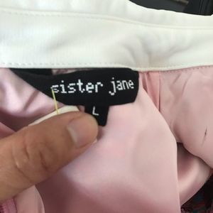 Sister Jane brocade mini shift dress. Unique dress with Peter Pan collar and embellished pin. Rhinestone and pearl details throughout. Small stain on cuff (may come out with washing) and stain on the interior lining as shown. Beautiful and funky piece! Size large Measurements from flat (approx) 18.5” armpit 17.5” waist 19” hip 34” length