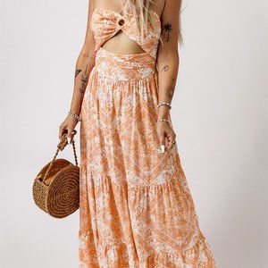 Orange O-ring Cut out Floral Print Strapless Maxi Dress