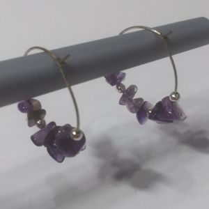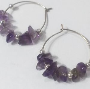Silver tone hoop earrings with amethyst chips and tiny silver beads. Good used condition.