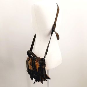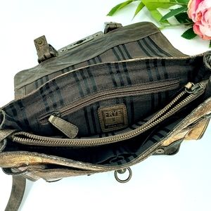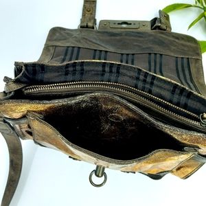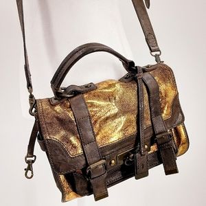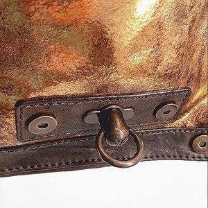 Revolve Frye Cameron antique look cracked metallic gold & copper & dark brown leather satchel style cross body bag.