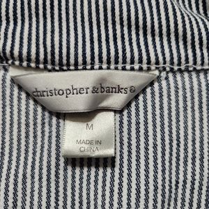 CHRISTOPHER & BANKS SIZE Medium, navy blue & white stripes, full zip front, lightweight, cotton & spandex blend. Rolled sleeves for a stylish look. The perfect fall jacket. Gently worn, excellent condition, no flaws.