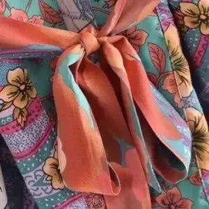 Gorgeous green multi colored floral cosmic bohemian galaxy printed short kimono robe with vented sleeves.