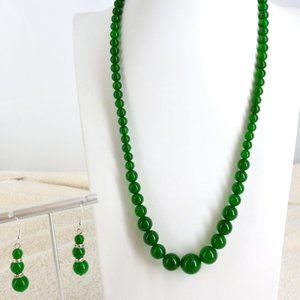 This set is a gorgeous shade of jade green. The necklace is adjustable from 19" - 22"; the earrings are 2" long. The beads in the necklace graduate from about 6.5 to 14 mm. The earrings are marked 925 on the hooks. These are New Without Tags and in perfect condition.