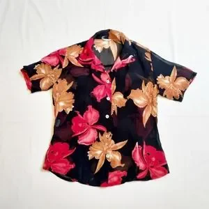 Red, brown and black floral and leaf print, short sleeve floral sheer shirt blouse from the 90s.